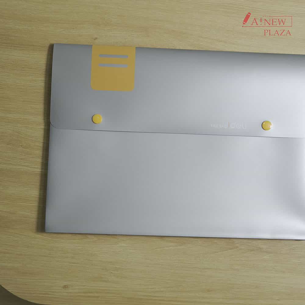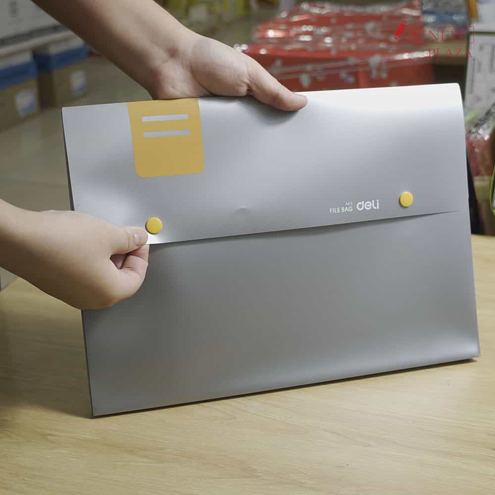 Cặp Đựng Tài Liệu 1 Ngăn Deli 5576 CÓ 2 NÚT CÀI. Không có quai xách, Có 2 nút cài chắc chắn. Chất liệu bằng nhựa dẻo PS cao cấp. Dùng để ưu trữ hồ sơ 50-100 tờ giấy A4 hoặc A5, hoặc có thể mang đi học thêm.
