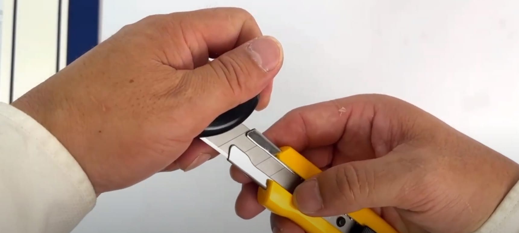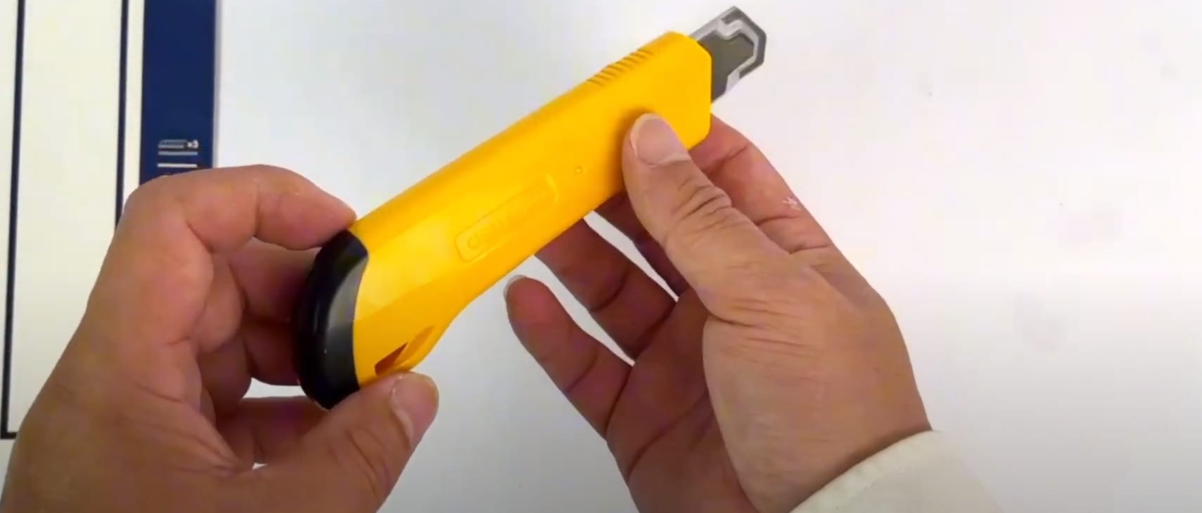 - Giữ con dao rọc giấy ở tư thế thoải mái và an toàn, với ngón tay cái và ngón trỏ nằm ở các điểm chốt trên tay cầm. Các ngón khác nằm trên tay cầm để tạo sự ổn định.