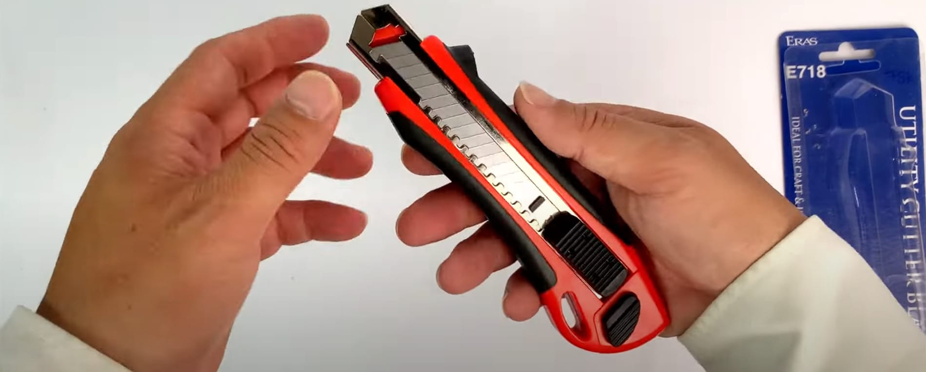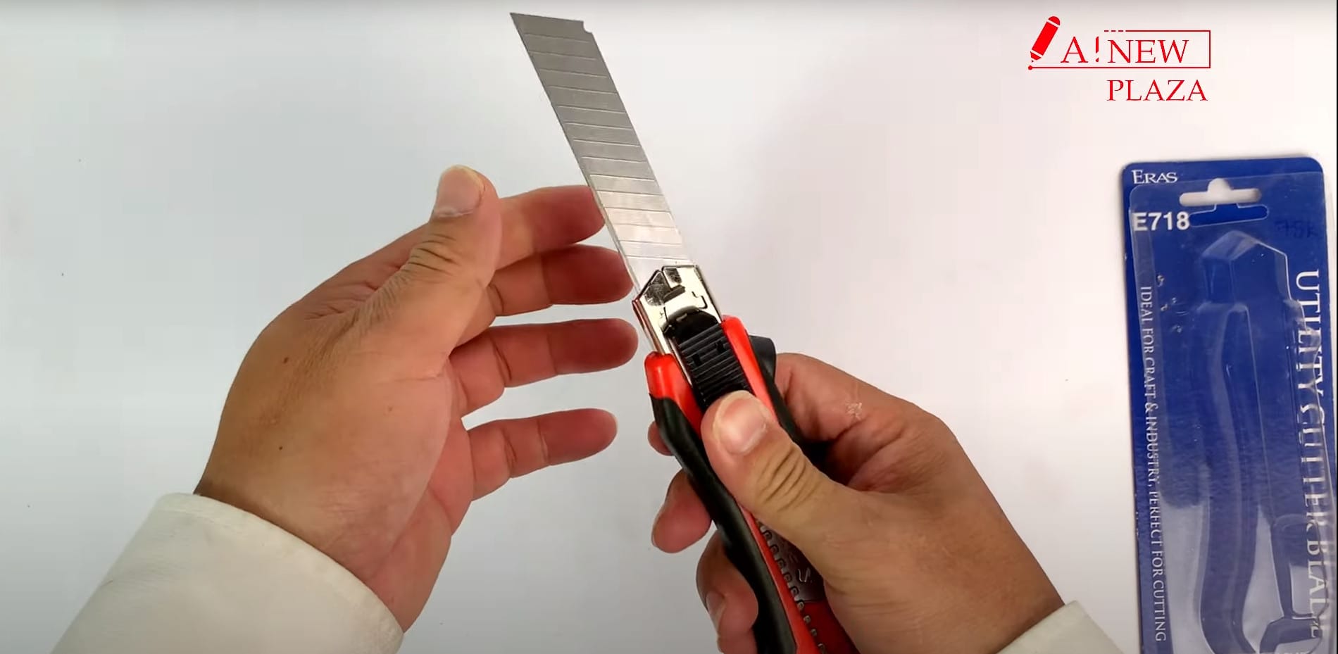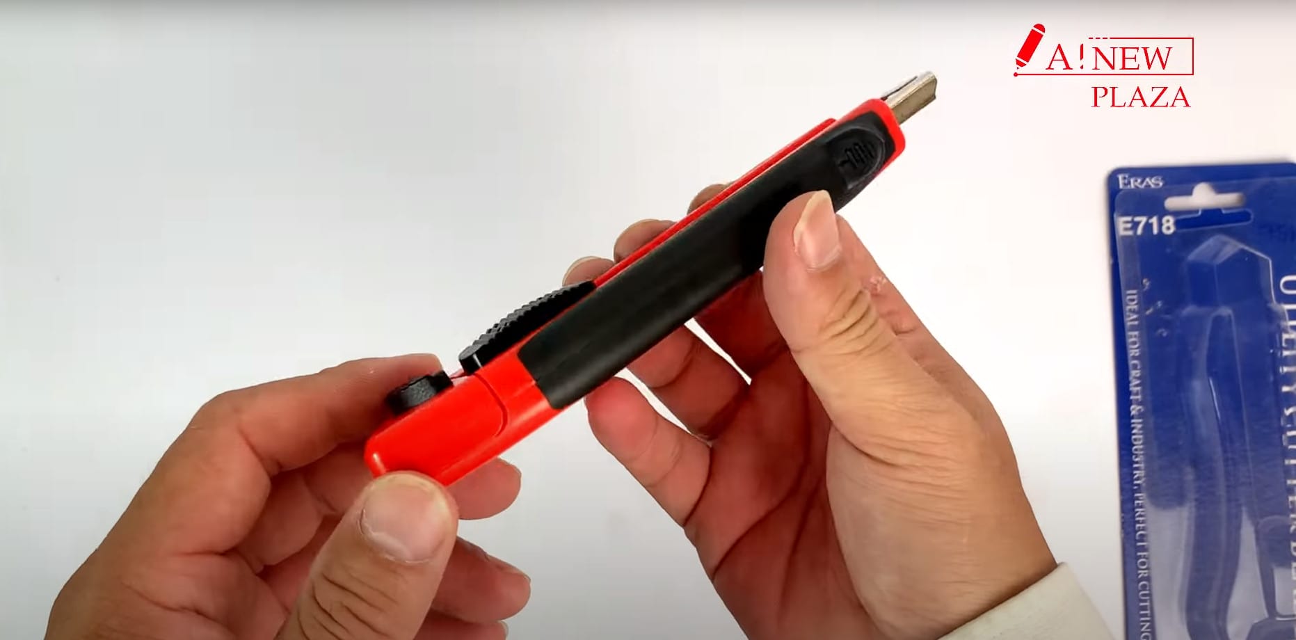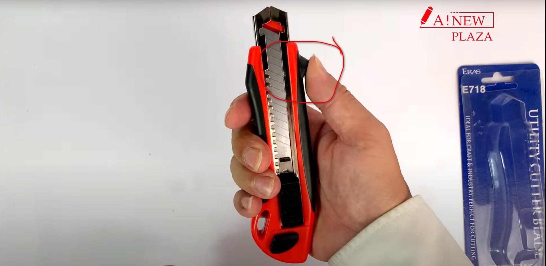 - Giữ con dao rọc giấy ở tư thế thoải mái và an toàn, với ngón tay cái và ngón trỏ nằm ở các điểm chốt trên tay cầm. Các ngón khác nằm trên tay cầm để tạo sự ổn định.