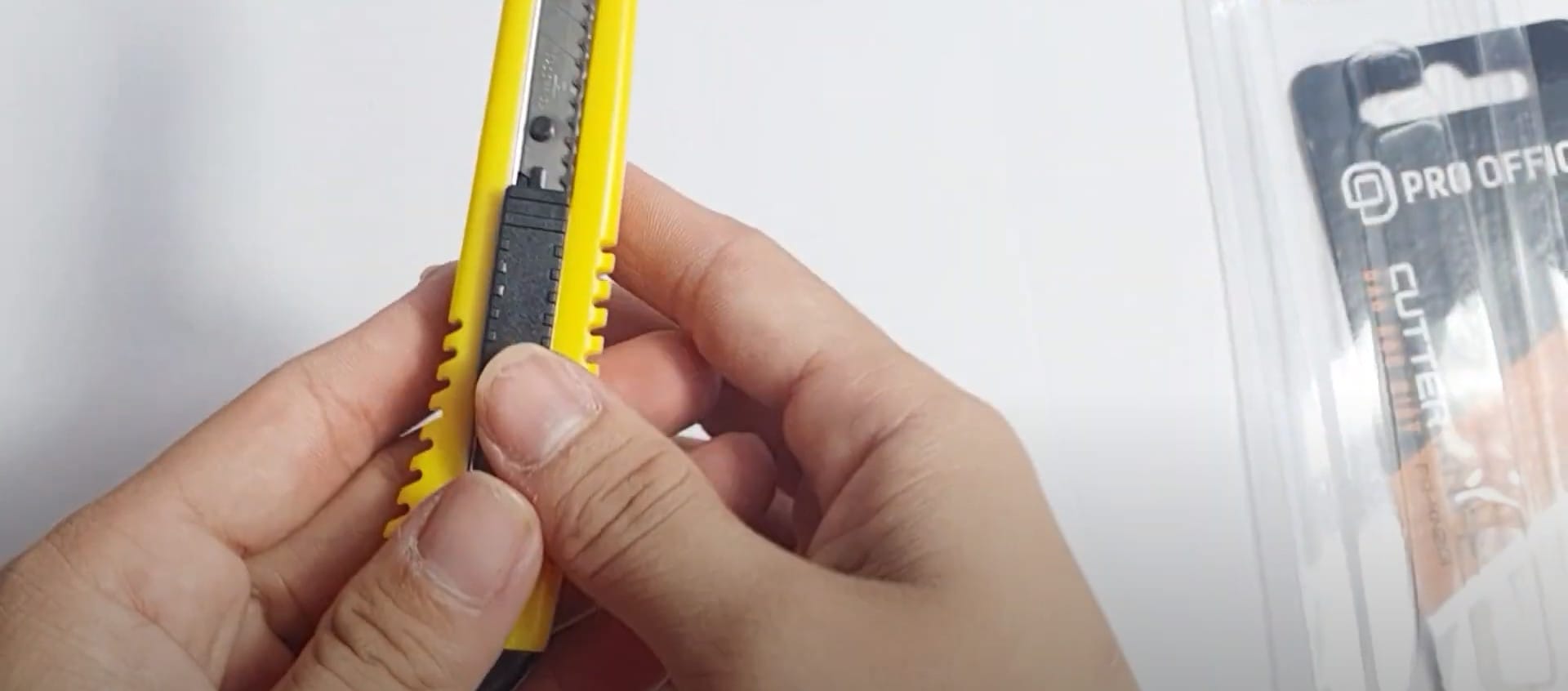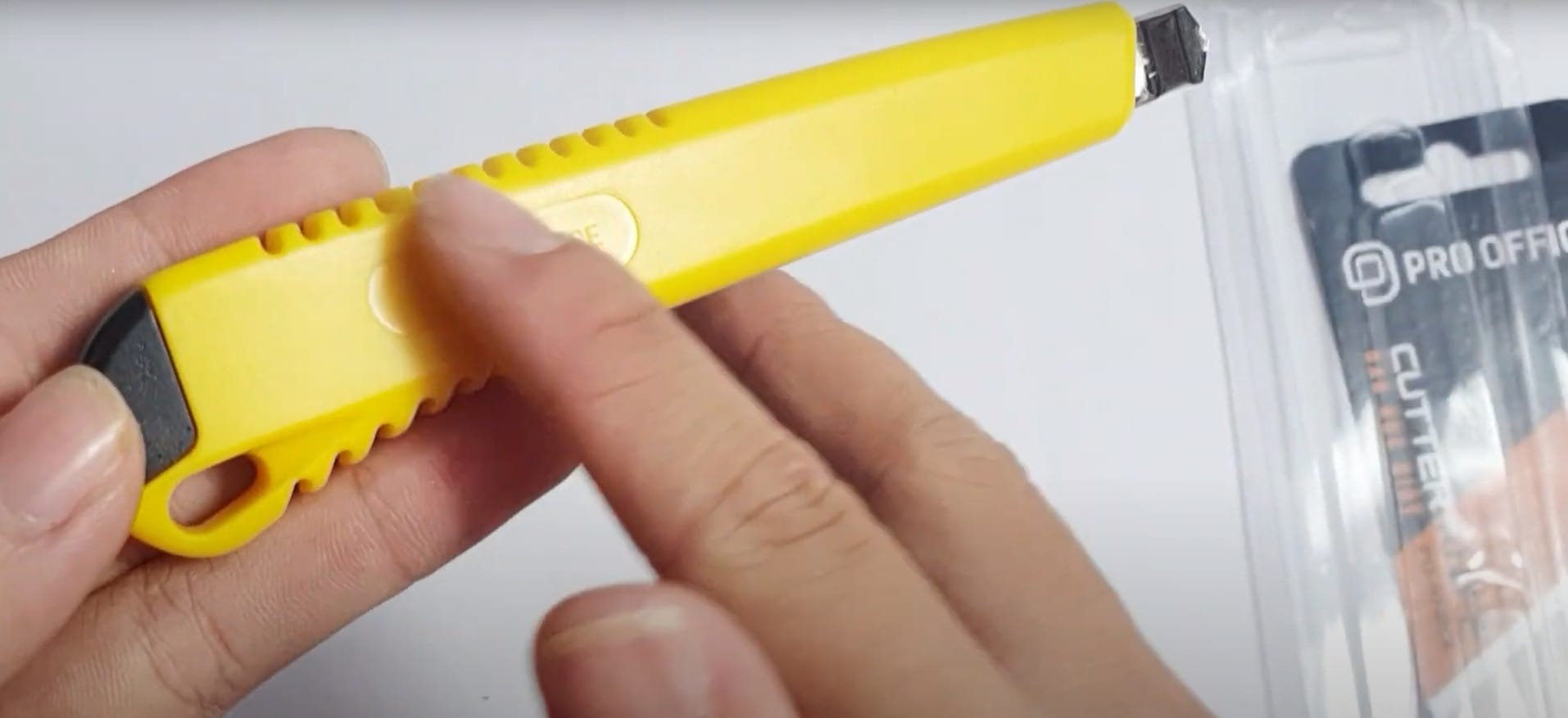 - Giữ con dao rọc giấy ở tư thế thoải mái và an toàn, với ngón tay cái và ngón trỏ nằm ở các điểm chốt trên tay cầm. Các ngón khác nằm trên tay cầm để tạo sự ổn định.