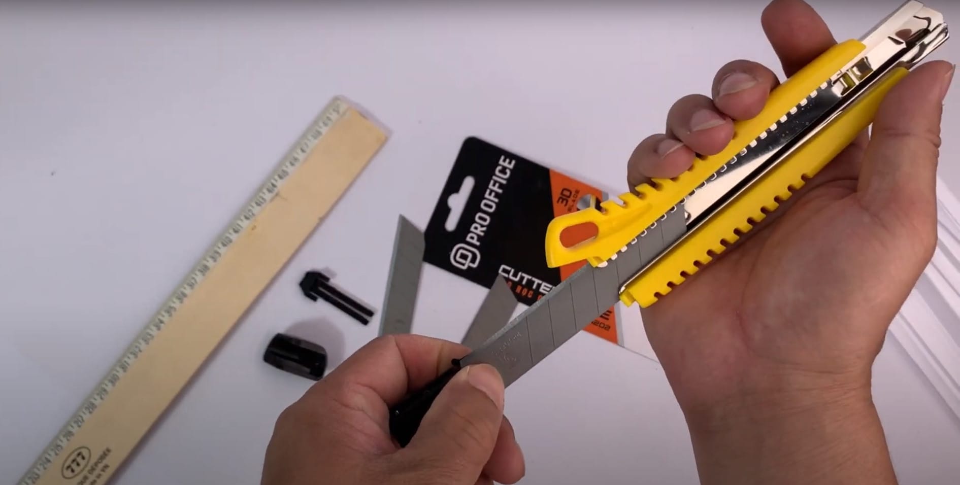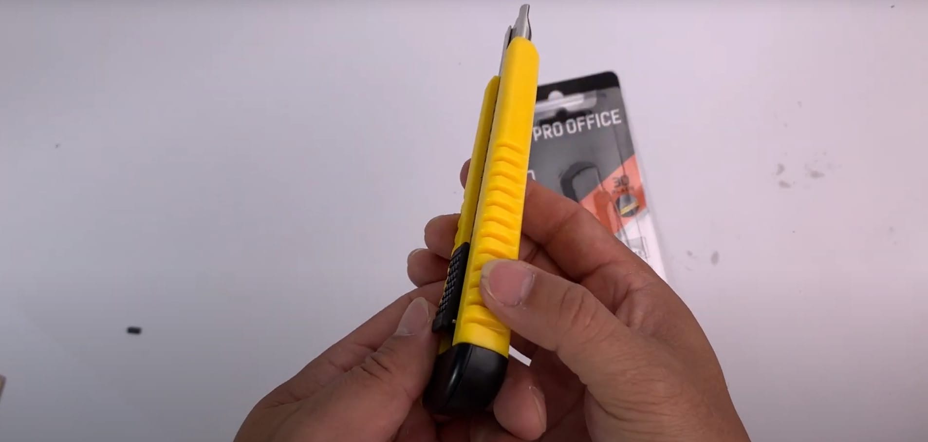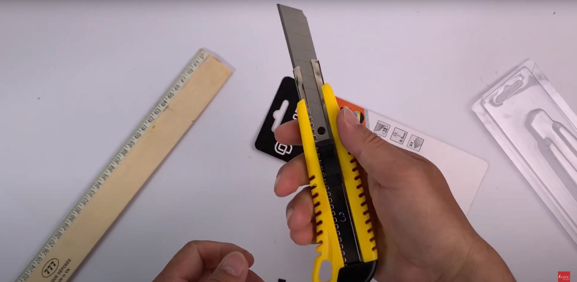 - Giữ con dao rọc giấy ở tư thế thoải mái và an toàn, với ngón tay cái và ngón trỏ nằm ở các điểm chốt trên tay cầm. Các ngón khác nằm trên tay cầm để tạo sự ổn định.