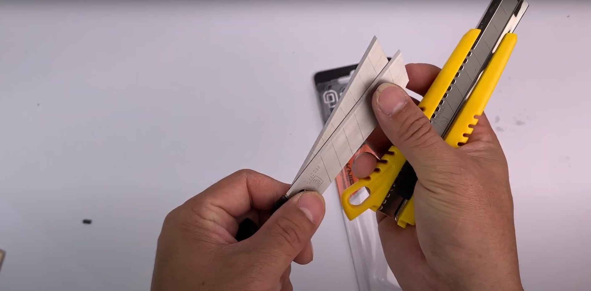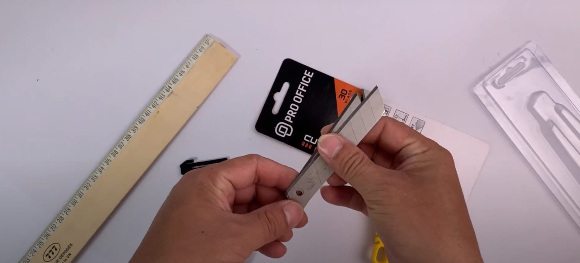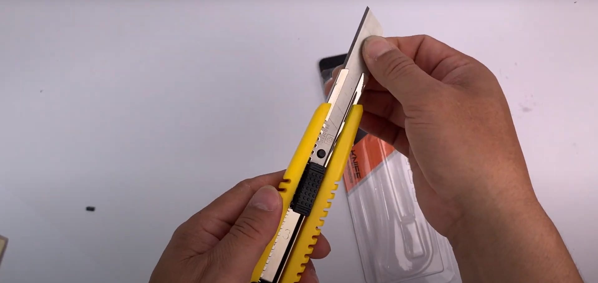 - Giữ con dao rọc giấy ở tư thế thoải mái và an toàn, với ngón tay cái và ngón trỏ nằm ở các điểm chốt trên tay cầm. Các ngón khác nằm trên tay cầm để tạo sự ổn định.