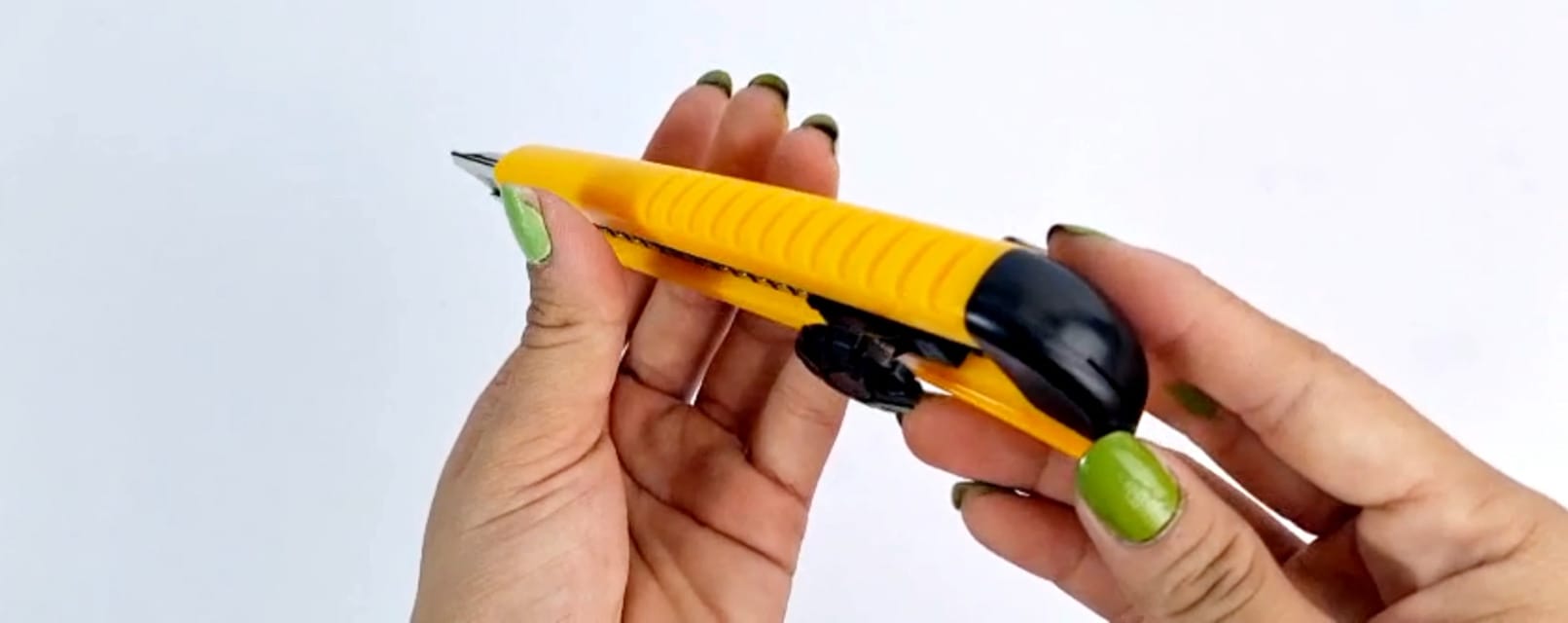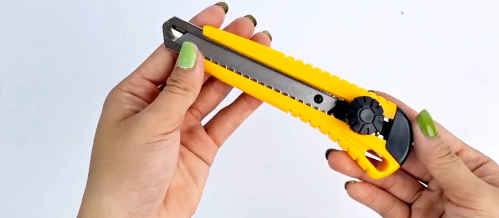 - Giữ con dao rọc giấy ở tư thế thoải mái và an toàn, với ngón tay cái và ngón trỏ nằm ở các điểm chốt trên tay cầm. Các ngón khác nằm trên tay cầm để tạo sự ổn định.