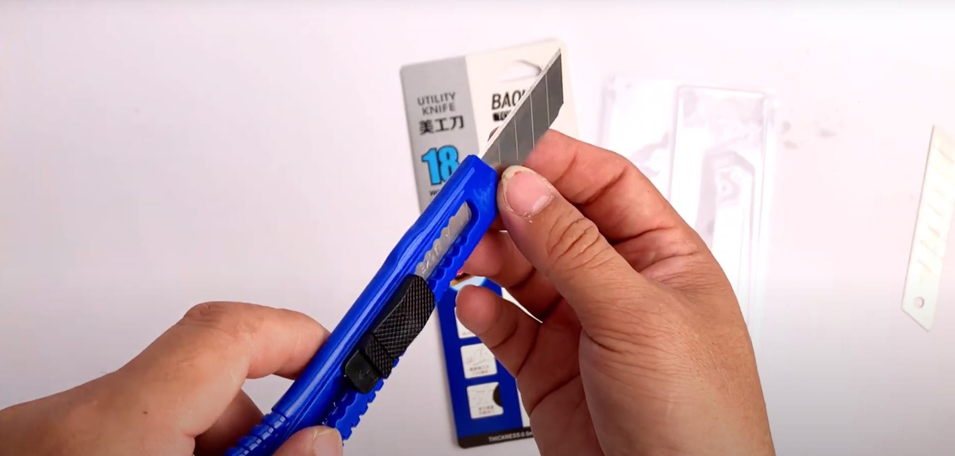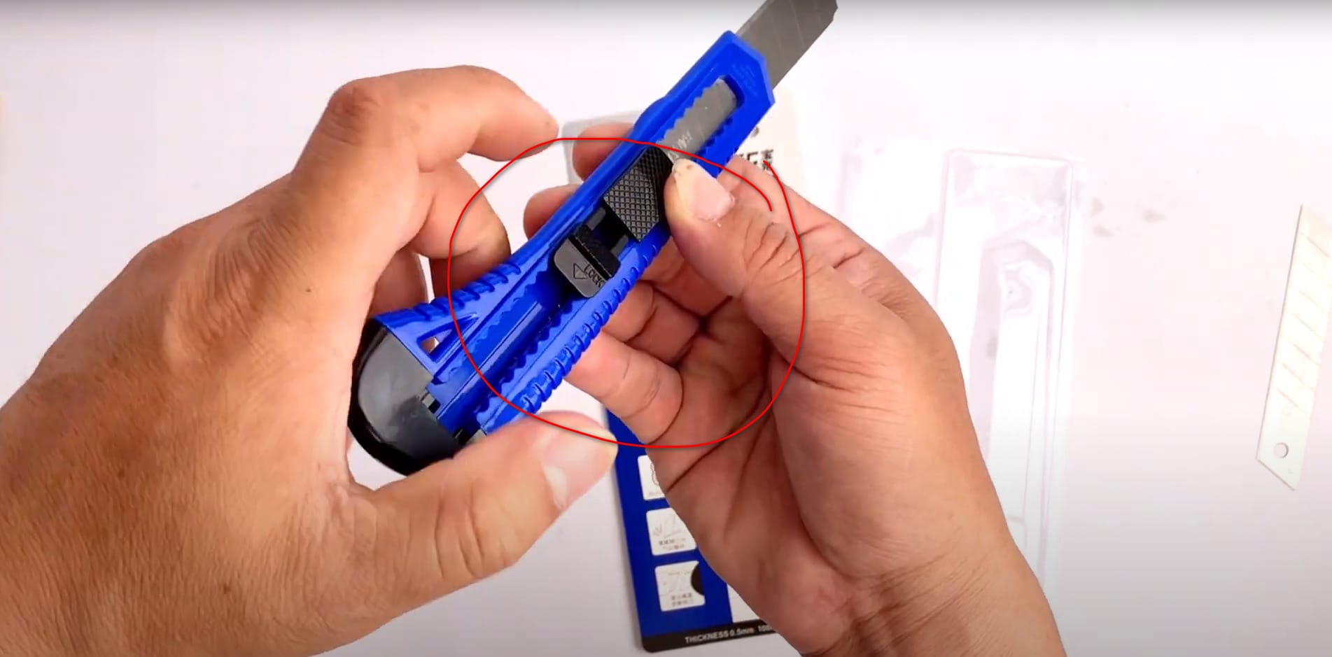 - Giữ con dao rọc giấy ở tư thế thoải mái và an toàn, với ngón tay cái và ngón trỏ nằm ở các điểm chốt trên tay cầm. Các ngón khác nằm trên tay cầm để tạo sự ổn định.