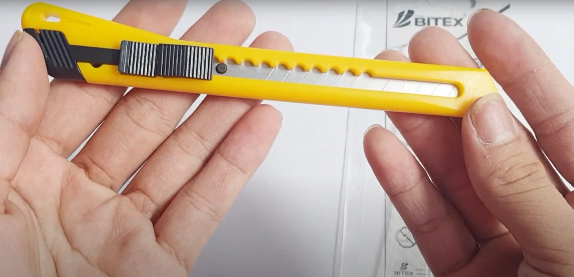 - Giữ con dao rọc giấy ở tư thế thoải mái và an toàn, với ngón tay cái và ngón trỏ nằm ở các điểm chốt trên tay cầm. Các ngón khác nằm trên tay cầm để tạo sự ổn định.