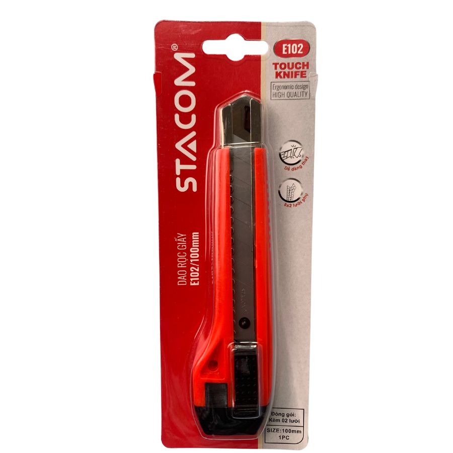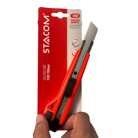 Dao rọc giấy trung Stacom E102 dáng đẹp, lưỡi thép, sắc lẹm, an toàn, tay cầm thoải mái. Cắt nhiều vật liệu như giấy, thạch cao, alu, mica, tấm formex. An toàn và tiện dụng