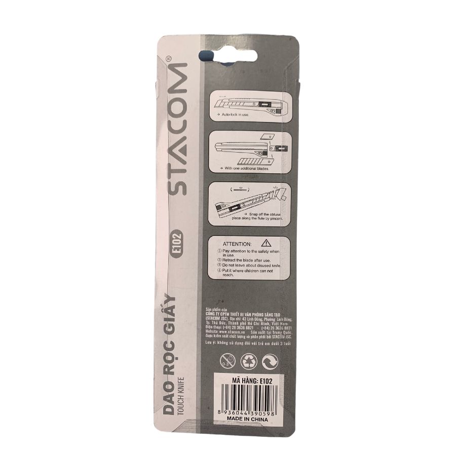 Cắt nhiều vật liệu: Con Dao rọc giấy Stacom E102 không chỉ giới hạn trong việc cắt giấy, mà còn có khả năng cắt vải, bìa cứng, hoặc nhựa mỏng. Điều này tạo ra một công cụ linh hoạt và đa dụng cho nhiều ứng dụng.