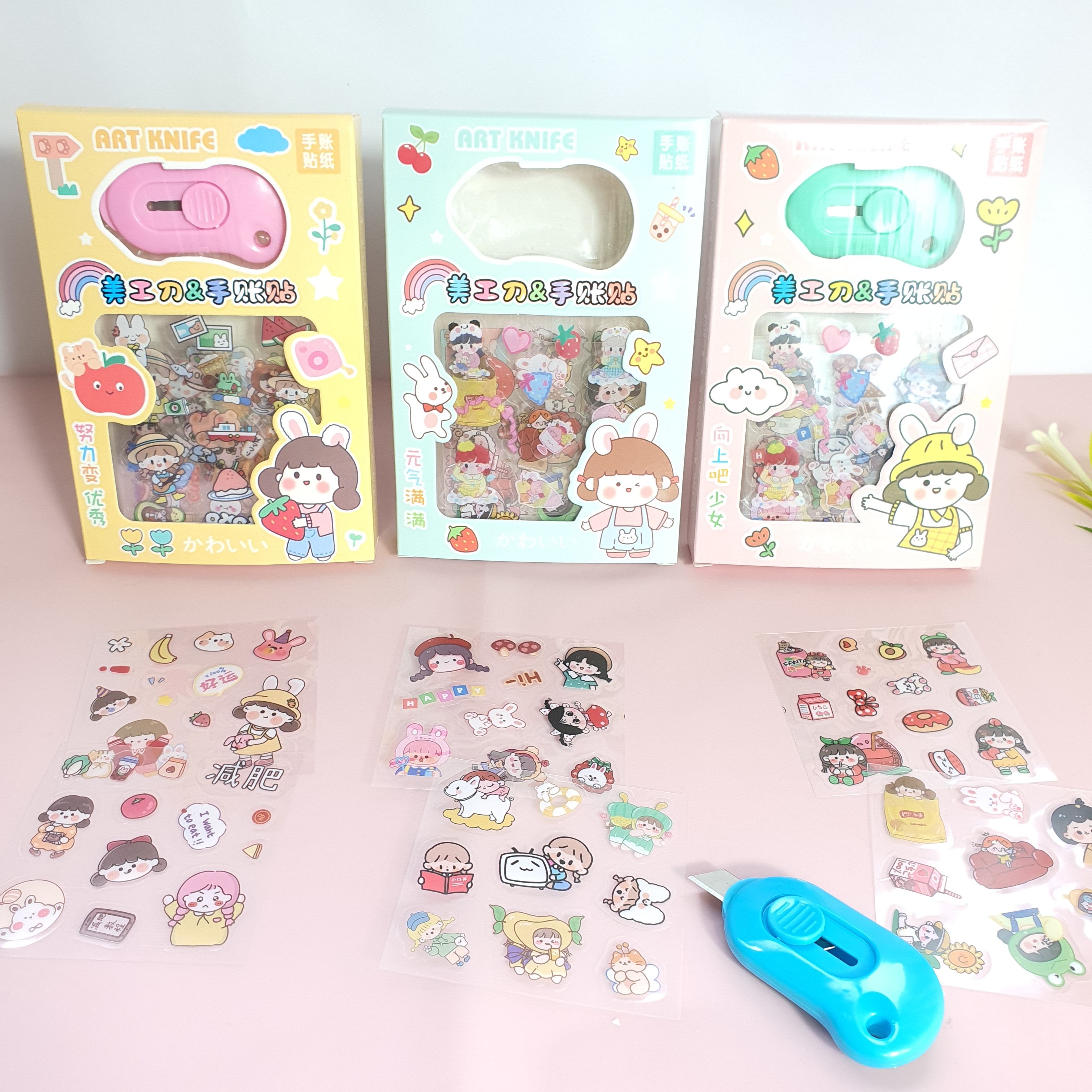 Hộp sticker dễ thương 8 miếng tặng kèm dao rọc giấy mini với nhiều mẫu khác nhau tha hồ cho các bạn lựa chọn
