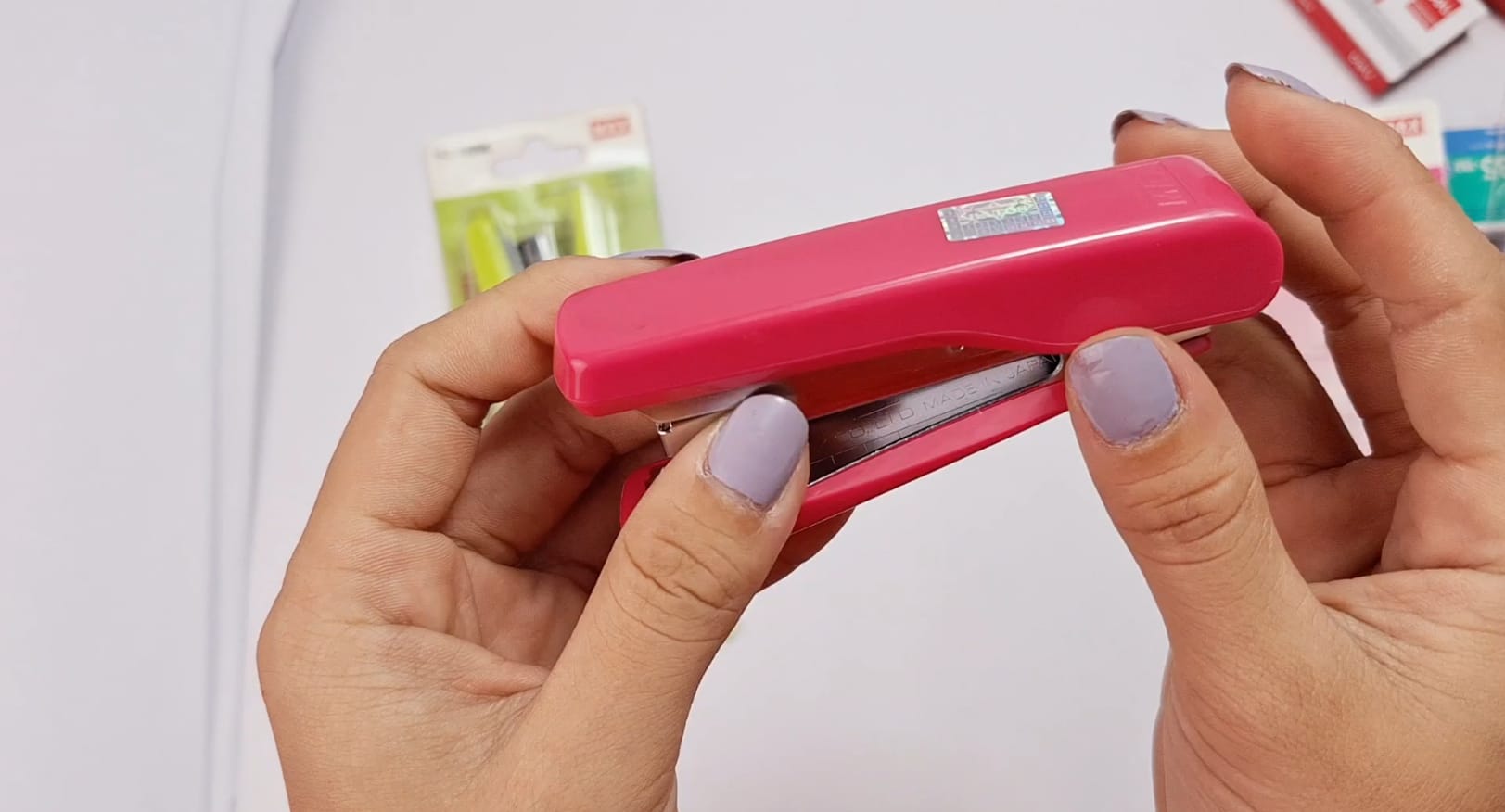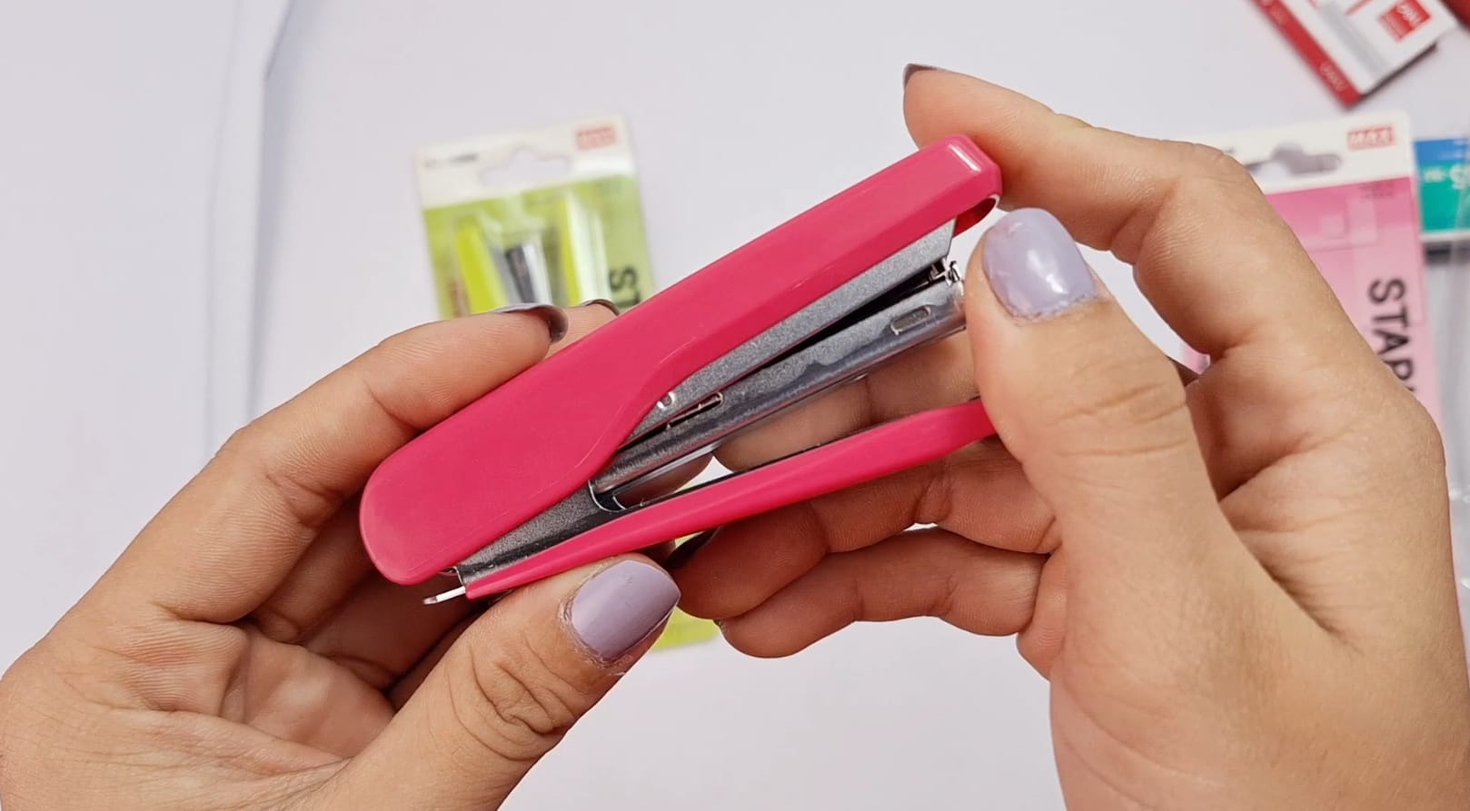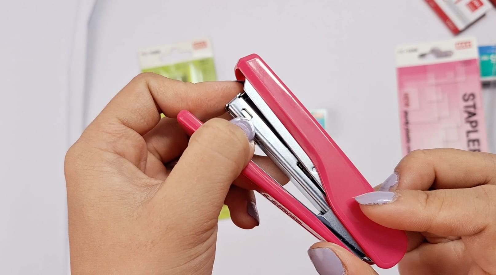- Chất liệu thân máy bấm: Vỏ nhựa, thân inox bóng sáng