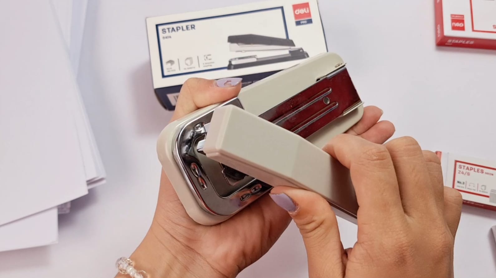 Mời bạn xem thêm video để hiểu rõ hơn máy dập ghim deli 0414 này nhé