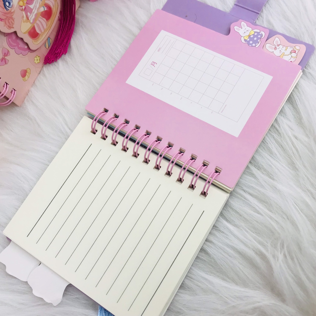 Sổ tay phân bìa trang có phần gáy là lò xo kép quen thuộc, với tông màu hồng và tím nhã nhặn hợp với sở thích với các bé. Lò xo chắc chắn, cố định các trang giấy tốt hơn